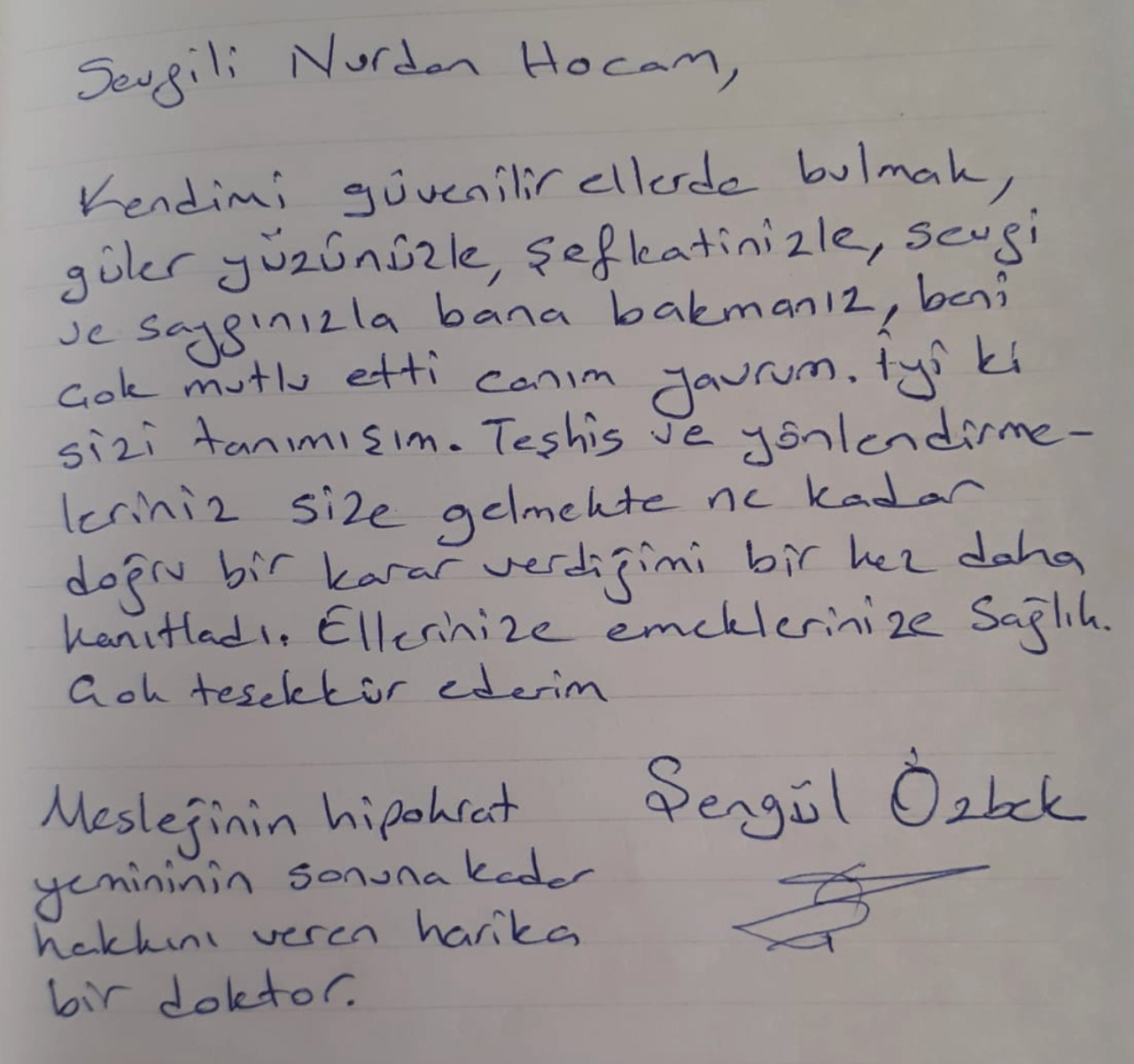 Sevgili Nurdan Hocam, Kendimi güvenilir ellerde bulmak, güleryüzünüzle şefkatinizle, sevgi ve saygı İzlanda bana bakmanız, beni çok mutlu etti canım yavrum. İyi ki sizi tanımışım. Teşhis ve yönlendirmeleriniz size gelmekle ne kadar doğru bir karar verdiğimi bir kez daha kanıtladı. Ellerinize emeklerinize sağlık. Çok teşekkür ederim. Mesleğinin hipokrat yeminini sonuna kadar hakkını veren harika bir doktor.