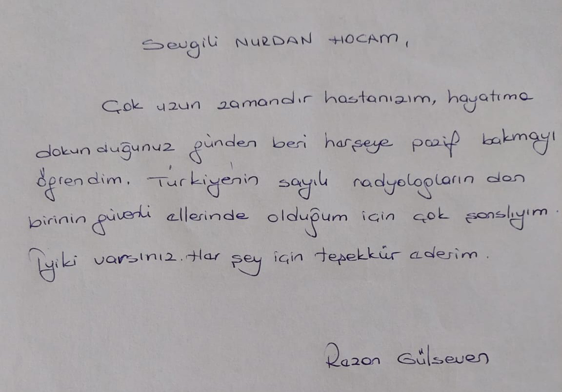 Çok uzun zamandır hastanızım, hayatıma dokunduğunuz günden beri herşeye pozitif bakmayı öğrendim. Türkiye'nin sayılı radyologlarından birinin güvenli ellerinde olduğum için çok şanslıyım. İyiki varsınız, herşey için teşekkür ederim.